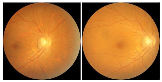 Glaucoma, which can cause irreversible visual impairment, is a widespread eye disease known as the “Invisible Vision Killer” due to its lack of noticeable symptoms in the early and middle stages, making it difficult to detect []. Glaucoma is anticipated to impact an increasing number of individuals globally because of an aging population [,,]. The clinical diagnosis of glaucoma is achieved through various methods, such as fundoscopy, optical coherence tomography (OCT), and visual field examination, as shown in Figure 1. OCT offers high-resolution information on the thickness of the cornea, retina, and optic nerve, but the importance of the thickness of the ganglion cell complex (GCC) in diagnosing glaucoma remains a matter of debate []. A visual field examination can detect glaucoma when more than 40% of the optic nerve is damaged, resulting in changes in the visual field that threaten vision as they develop from the periphery, invade the center of the visual field, and advance. POAG, more prevalent in Westerners, leads to a gradual loss of vision, while PACG, more common in Easterners, causes rapid intraocular pressure increases, resulting in symptoms such as halo, blurred vision, severe eye pain, and nausea. Early screening is essential to prevent irreversible visual impairment.