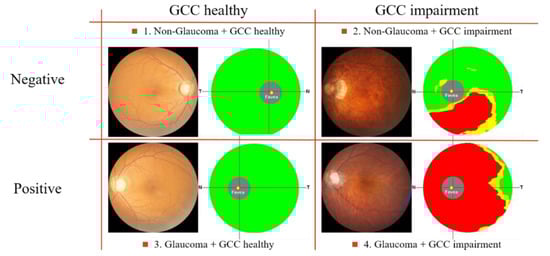 The NTUH dataset was divided into four categories based on the glaucomatous condition and the thickness of the GCC layer. Category 1 and 4 were used as positive and negative samples for the training process, as shown in Figure 14.