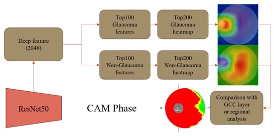 In the CAM section, the ResNet50 model framework is used to extract the results of 2048 depth features from the AvgPool layer. The discrimination power of each depth feature is calculated using a decision stump to distinguish between glaucoma and non-glaucoma categories. The top 100 features representing these categories are selected based on their ranking, as shown in Figure 15, and their classification results in all fundus images for glaucoma and non-glaucoma categories are obtained with confidence. The top 200 fundus images in each category with the highest match for each feature are ranked and output as a heatmap. This helps to identify the areas of fundus imaging that are most important for determining glaucoma. Additionally, the GCC thickness information is compared to explain the model’s prediction, identify areas of interest, and correlate them with clinical domain knowledge.