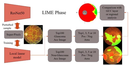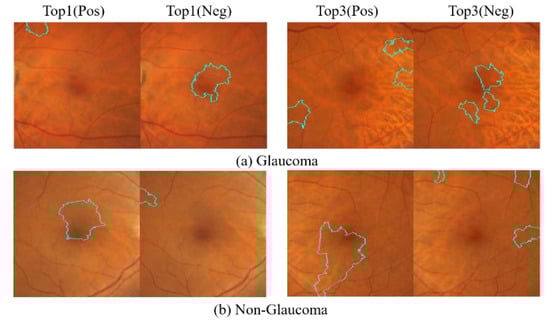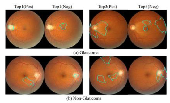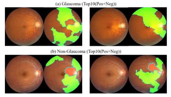 The fundus images were sliced using Super-Pixels, and the trained ResNet50 network model was perturbed to take samples. The perturbed samples were fed into the network model for prediction to train a linear model, and the behavior of this linear model at the sample points would be similar to the original deep learning model. The trained linear model is then used to predict the sample, obtain the classification results and confidence level of each fundus image for glaucoma and non-glaucoma, and then obtain and rank the top 100 images with the highest confidence level for glaucoma and non-glaucoma, respectively. There are two circumstances: the top 1, 3, and 5 positive or negative area maps, or the top 10 area maps with both positive and negative areas, as shown in Figure 16. The positive area means that the network will judge the whole image as a plus-decision area of that category, which is marked in green; the negative area means that the network will judge the whole image as a minus-decision area of another category, which is marked in red; the area mentioned here is the area obtained by slicing the fundus image using Super-Pixels. Finally, the positive and negative region maps were superimposed on the original fundus images, and the output region maps were observed for the regions of interest or major decision areas for different classification results. They were then further compared with the GCC thickness information or clinical diagnosis experience to explain why the model made the prediction and which regions were looked at, corresponding to the clinical domain knowledge.