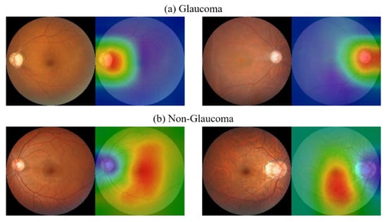 The results of the CAM analysis for two categories are shown in Figure 17. From the results of the CAM experiment of CM images, it can be found that when the images are judged as glaucoma, the area of greatest concern for the model is the optic disc area, and this part is also consistent with the clinical diagnosis experience. In non-glaucoma cases, the opposite result was found as in glaucoma cases, where the model focused on all areas except the optic disc, with emphasis on the macula and its surrounding areas.