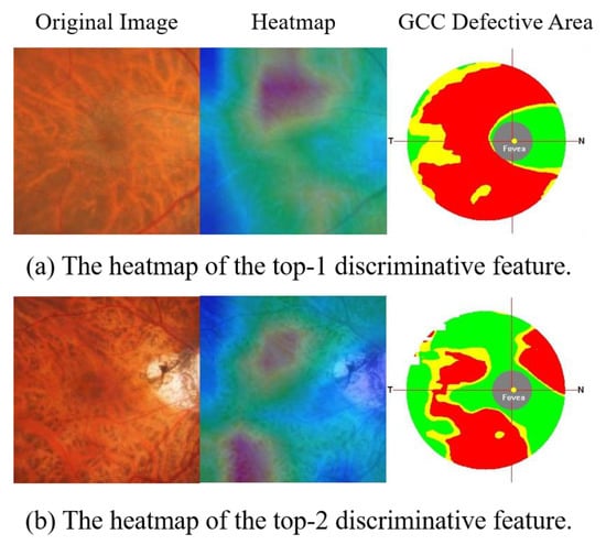 The first and second most discriminating features are further extracted from the heatmap and compared with the GCC thickness map. It can be found that the areas of interest and structure of the model are to some extent similar to the damaged areas of the GCC layer. Discriminative features are visualized as shown in Figure 18. This again validates the model’s ability to observe subtle non-robust features on the macula and its surrounding areas, as well as providing information on GCC layer damage and the relevance of GCC layer damage to the development of glaucoma after incorporating GCC thickness information.