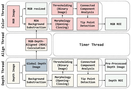 Kinect 2.0 is able to provide both RGB and depth images with an additional calculated RGB-depth-aligned image (RDA). It provides depth images in 512 × 424 pixels and RGB images in 1920 × 1080 pixels. Data acquisition was achieved in real-time with RGB and depth data being captured simultaneously. For this purpose, we developed a multi-thread-based system. During data acquisition, three separate threads were run to acquire RGB, depth, and RDA images. A fourth thread was used for tracking time measures, making sure each gesture is recorded for a duration of 5 s. Before every recording, for a duration of 10 s, background images in RGB, depth and RDA were still acquired with no moving object present. RGB images are resized in half (960 × 540) to reduce the computing complexity. Data acquisition steps and stored data types can be seen in Figure 2.