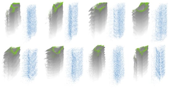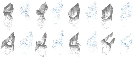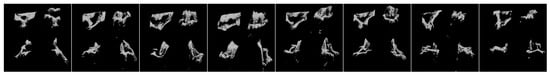 Projecting point clouds to acquire 2D information is a method used in various studies [33,34]. A 3D point in space can be represented in a 2D plane using a projection matrix (Equation (1)). In our study, we projected our PCD data to four different viewpoints in space (top, front, left, right), rendering and concatenating the end result using Open3d and OpenCV. Figure 12 shows examples from projection images.