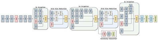 - Szegedy, C.; Vanhoucke, V.; Ioffe, S.; Shlens, J.; Wojna, Z. Rethinking the inception architecture for computer vision. In Proceedings of the IEEE Conference on Computer Vision and Pattern Recognition, Las Vegas, NV, USA, 27–30 June 2016; pp. 2818–2826. [Google Scholar]