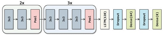 In order to make use of spatio-temporal information, a set of frames from a gesture can be used with LSTM networks [35]. A custom VGG-16 - LSTM network was trained with RGB and projection images. PCD features were extracted from a trained PointNet for PointNet–LSTM network. For LSTM networks, length of the frame stack for RGB images was selected as 40, because this was the most common lowest frame count for 5 s recordings in dataset. For projection and PCDs, it was selected as 120 because of the same reason. In total, 7 sessions in RGB and 13 sessions in depth had a lower amount of frames than the determined thresholds, thus they were ignored during training and testing for LSTM networks. LSTM networks has structures called cells which contain state information and gate mechanisms. Three different gates (input, forget, output) decide which information will update the cell state and outputs, making it possible to use temporal information. LSTM netwoks can efficiently be combined with CNNs for image-based temporal classifications.