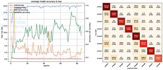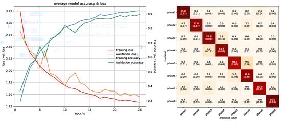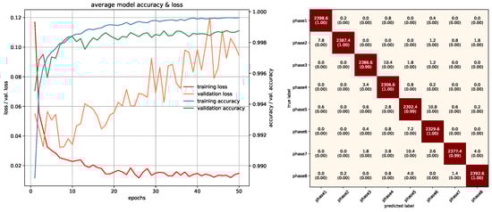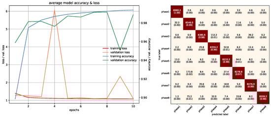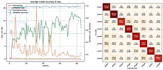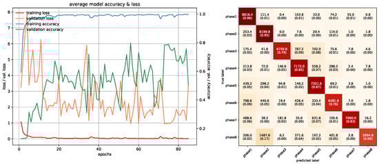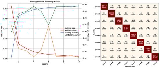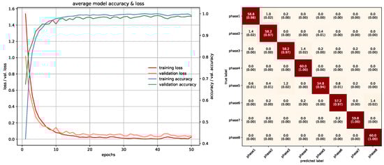 In this study, networks that were used with RGB ROI images were trained with 10 epochs. PointNet with PCDs was also trained with 10 epochs since the dataset was large enough to make the networks converge. Projection images used a special training method due to memory requirements, which was mentioned in the previous section, and was trained with 85 epochs. In PointNet PGM training, 25 epochs were used because there was room for improvement as the network kept converging. LSTM and Fusion networks were easier to train in terms of duration, they were trained with 50 epochs. Average accuracies of all 5-fold models of each architecture can be seen in Table 3. All accuracies and losses for each epoch in 5-fold models were averaged to obtain an average graphic. In some folds, validation error spikes were higher than the others, thus it reflected the average graphics. Figure 17, Figure 18, Figure 19, Figure 20, Figure 21, Figure 22, Figure 23, Figure 24, Figure 25, Figure 26, Figure 27 and Figure 28 show average confusion matrices of test data and average training accuracies/losses of 5-fold models. The greatest accuracy was achieved with the PointNet-LSTM model with 100% classification performance. Inception-V3 RGB model followed this with 99.87% and MobileNet-V1 RGB model became third with 99.75%. The least accurate model was ResNet-50 projection with 81.37%. The greatest inaccuracy among steps was seen with phase8 in the Resnet-50 projection model (Figure 22). As can be seen from the results, all models achieved acceptable performance. We could speculate that if projection images were trained with a greater amount of validation and training partitions, their accuracy would be higher too. It can also be speculated that including arms had a positive effect on classification accuracy because in each gesture they have a distinct posture.