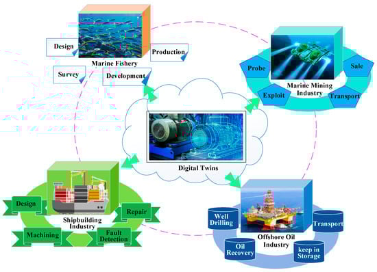 The marine economy is a multi-faceted realm that encompasses the exploitation, utilization, and conservation of marine resources and spaces, giving rise to various ocean-related industries such as marine fisheries (including marine fishing and mariculture), saltwater production and salinization, OOGI, marine transportation (including ports and shipping), coastal mining, and shipping, as well as other material production-related sectors such as coastal tourism and seabed storage []. In addition, it encompasses seawater desalination, comprehensive utilization of seawater, marine energy development, marine drug utilization, marine space utilization, deep-sea mining, marine engineering, comprehensive marine science and technology education services, marine information services, and environmental protection []. Thus, the marine industry serves as the cornerstone and driving force of the marine economy, comprising a collection of economic activities with similar attributes, and serving as a prerequisite for the existence and growth of the marine economy. In recent times, DTT has found applications in the marine industry, including ship manufacturing, LCM, OOGI, and marine resource development (Figure 3), facilitating intelligent industry development while safeguarding the marine environment [,,].