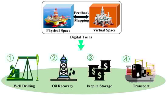 According to the existing literature, the digital transformation of the OOGI is continuously evolving, necessitating the urgent need for new and innovative ideas to develop the OOGI and optimize the benefits of the entire industry value chain. Notably, DTT has emerged as a promising solution to seamlessly integrate various digital technologies, such as data sharing, security, and application cloud, thereby enabling intelligent oilfield construction, engineering intelligent manufacturing and factory design, and Internet-trade platforms. However, it is crucial to thoroughly consider network security and other brand systems while building Digital Twins models for the OOGI. The application of DTT in the offshore oil industry is shown in Figure 6.