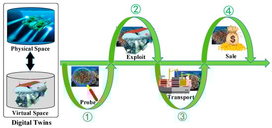 Schematic diagram of the full lifecycle application of DTT in the marine emerging energy industry (1–4 represents the full lifecycle of DDT application in the marine emerging energy industry, where 1 represents probe, 2 represents exploit, 3 represents transport, and 4 represents sale).