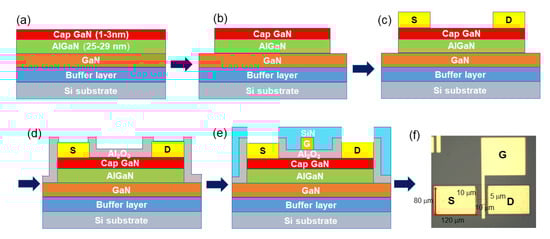 Flowchart of fabrication of heterostructure HEMT device: (a) device structure, (b) mesa etching using ICPRIE, (c) deposition source (S) and drain (D) electrodes, (d) Al2O3 gate oxide layer deposition, (e) deposition of gate electrode, then SiNx as a passivation layer and open S, D, G electrodes, and (f) optical microscope image of the fabricated HEMT device.