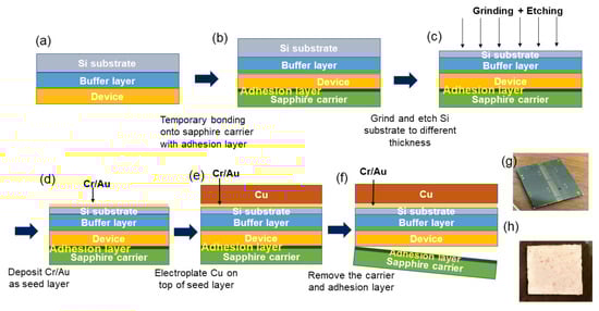 Process flowchart of backside heat dissipation structure: (a) device facing down, (b) device side bonded to sapphire using a template adhesive layer, (c) reducing Si substrate to 150 µm by grinding and chemical etching, (d) seed layer using Cr/Au deposition, (e) electroplating the Cu permanent substrate, (f) removing the carrier substrate (sapphire), (g) face-up view of the final device and (h) face-down view of the final substrate.