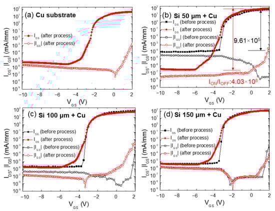 The detailed DC characteristics of fabricated GaN/AlGaN HEMT devices before and after the backside process were studied by measuring IDS and |IGS| as a function of VGS. Here, the IDS and |IGS| were normalized for a gate width of 80 μm, and device dimensions are shown in Figure 1f. Figure 3a,b illustrate the IDS-VGS measurements at VDS = 4 for samples with only a 50 µm thick Cu substrate and for those on 50 µm thick Si substrate before and after the backside process (BSP), i.e., in comparison with electroplated Cu layers. For samples where the Si substrate was completely etched away, leakage current dropped to ~ 10−5 mA/mm, as shown in Figure 3a. The authors note that HEMT transfer characteristics shown in Figure 3a prior to the backside process cannot be measured owing to the remaining GaN HEMT epilayer being <6 µm (it was too thin to measure). A two-order drop in leakage current from 10−4 mA/mm to <10−6 mA/mm and an increment in the switching ratio from 9.61 × 105 to 4.03 × 108 can be observed in Figure 3b for samples with a 50 µm thick Si substrate before and after Cu plating, respectively. Here, IDS values are affected not only by self-heating, but also by HEMT epilayer stress. The epilayers were designed to have compressive stress during growth and are counterbalanced by Si substrate stress during post-growth cooldown. As the Si substrate is removed, the GaN HEMT epilayer can return to a compressive stress state. Although the epilayer was electroplated with Cu, the tensile stress of the GaN epilayer should be smaller than that of GaN on a Si substrate with a Cu film. Consequently, the IDS (shown in Figure 3a) of the GaN HEMT solely with Cu metal was smaller than that (shown in Figure 3b,c) of a GaN HEMT with combined Si and Cu metal substrates. For samples with 100 µm and 150 µm of Si substrate before and after Cu plating, leakage current did not decrease significantly; moreover, current switching was maintained at around 107, as shown in Figure 3c,d. In terms of |IGS|, these values ranged from 10−6 to 10−8 mA/mm as VGS was less than 0 V for all samples. Even for a positive applied VGS, measured values were <10−3 mA/mm for all samples.