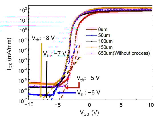 For comparison, the IDS−VGS measurements for all four samples with electroplated Cu on different Si substrate thicknesses are shown in Figure 4. The lowest leakage current was observed for Cu electroplated on a 50 µm Si substrate. Furthermore, the device threshold voltage (Vth) after removal of the Si substrate was on the right side compared to devices with different Si substrate thicknesses on Cu substrates. For devices on 650 µm thick Si substrate (before BSP), Vth was approximately −3 V. After thinning and electroplating with Cu, Vth was −8, −7 and −6 V for HEMTs with Si thicknesses of 150 µm, 100 µm and 50 µm, respectively. Moreover, Vth recovered to −5 V for the HEMT with only a Cu substrate. Threshold voltage increased from −8 V to −6 V with Si substrate thinning and recovered to −5 V after Si substrate removal. This may be attributable to residual stress variations and will be discussed in the Raman measurement section.