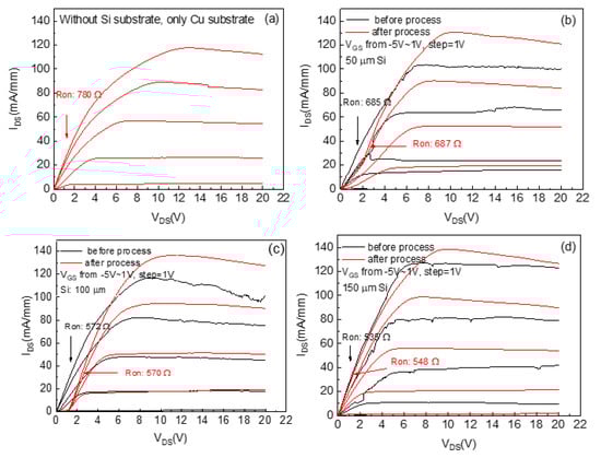 ID−VDS characteristics before and after BSP: (a) complete removal of silicon substrate; (b) 50 μm, (c) 100 μm and (d) 150 μm thick silicon substrate with electroplating of 50μm thick copper in each case.