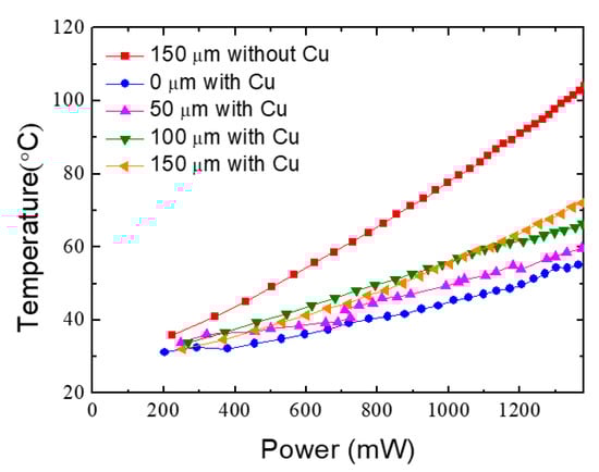 To study the effect of BSP on HEMT heat dissipation, temperature measurements for the above samples were performed at VDS from 0 to 210 V at VGS 0 V. The temperature as a function of input power is shown in Figure 6. The surface temperature was observed to increase owing to channel self-heating with increasing applied power for all devices. The device on 150 µm thick Si substrate without Cu presented the highest surface temperature. In this case, the surface temperature increased to 105.1 °C at 1300 mW. Correspondingly, the thin film HEMT with a Cu substrate presented the lowest surface temperature as Cu has a high thermal conductivity (Table 1). Here, the surface temperature only reached (approx.) 55 °C. This indicates an obvious improvement in heat dissipation after Cu electroplating. In addition, when comparing the four electroplated samples with different Si thicknesses, it was observed that under the same input power, the surface temperature gradually decreases as the Si substrate becomes thinner, until the surface temperature reaches a minimum after substrate removal. Moreover, the slopes of the temperature–power relation for devices on Si substrate with 100 µm and 150 µm thickness plated with 50 µm thick Cu were similar. One possibility is that heat dissipation was impeded by Si being too thick, even though the device temperature on 150 μm Si was higher than that on 100 µm substrate material as power increased to >1100 mW. This suggests that substrate thinning can also improve heat dissipation efficiency. In any case, since Cu is an excellent thermal conductor, electroplating Cu on the device backside aids homogeneous heat distribution, thereby reducing overall device temperature.