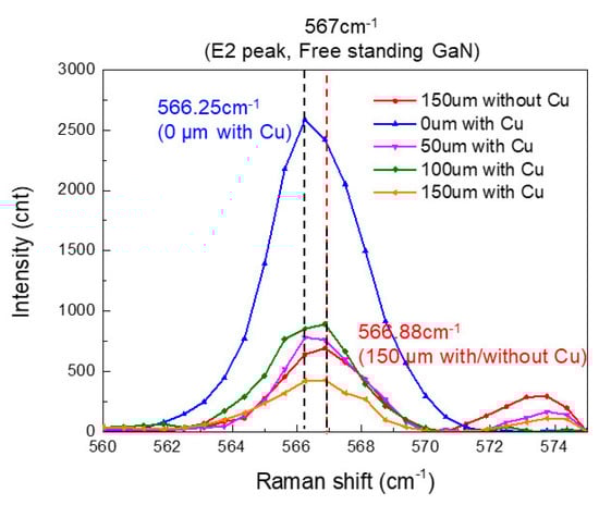 It was expected that Cu electroplating would not induce stress on the fabricated devices as processing occurred at room temperature. We performed Raman spectroscopy measurements to observe the degree of change in stress caused by electroplating and its effect on device characteristics. As shown in Figure 7, after the complete removal of the Si substrate and electroplating, the peak position shifts to 566.25 cm−1, suggesting the GaN lattice is under tensile stress as compared with the E2 peak (567 cm−1) of free-standing GaN [46,47]. In addition, we observed the same peak position and almost the same E2 peak with and without Cu electroplating in the case of devices on 100 µm and 150 µm thick Si substrate. This indicates that the GaN/AlGaN epilayer stress was balanced by the Si substrate with electroplated Cu metal. Additionally, for devices on 50 µm thick Si substrate, as well as for devices after complete removal of Si substrate and Cu electroplating, matching peaks were observed. These results suggest that the stress mainly derives from the thick Si substrate. It is well known that it is necessary to control stress for GaN/AlGaN growth on Si substrate. As the Si substrate was reduced, GaN/AlGaN stress could return to its original type, i.e., compressive stress. After electroplating with Cu, GaN stretching becomes more pronounced. Moreover, the existence of the 2DEG in GaN/AlGaN originates from spontaneous and piezoelectric polarization effects. When the Si substrate is gradually thinned, epitaxial stress is gradually controlled by the electroplated Cu. Although electroplating was processed at room temperature, there could exist stress induced by the plating parameters. Tensile stress induced from the electroplated Cu could increase piezoelectric polarization and IDS. The IDS results (Figure 5a) of the epilayer/ Cu configuration depict the smallest values of this study, suggesting there may exist some further issues influencing IDS that shall be clarified through further study. Finally, if Cu plating parameters can be optimized, the stress between GaN and Cu can be controlled in much the same way as GaN and Si; such an approach is currently under investigation to further improve device characteristics.