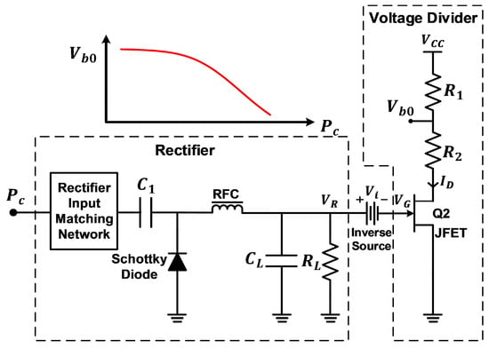 The detail schematic of the proposed ADB circuit is shown in Figure 3. This network deploys an AC-DC converter, which rectifies the coupled signal into DC positive voltage . The rectifier topology utilizes a Schottky diode in a shunt, which was investigated in [15,16]. The RF coupled power is initially delivered through a rectifier input matching network to obtain a maximum signal across the diode. Then, the diode rectifies the negative half cycle of the signal, and the overall energy is stored in . The combined network of a RF choke and acts as a DC-pass filter, which smooths the rectified voltage. The DC output voltage determines the positive terminal of the inverse source and creates negative voltage on the other side to control the JFET current flowing in a voltage divider network. Finally, the voltage divider yields , exhibiting an inverse variation with the coupled signal power as shown in Figure 3.