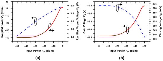 (a) Simulated coupled voltage and rectifier output voltage , and (b) simulated gate voltage and biasing voltage .