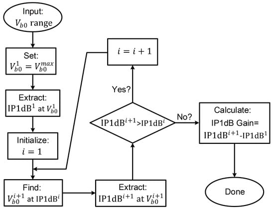 Figure 6 presents the variation of , , , and according to the input power spreading from dBm to 0 dBm. It can be seen that the coupled power exhibits a positive slope with and a high-enough value at dBm so that the rectifier can detect and rectify the wave. As a result, increases to the highest value of V at dBm; with V, changes from V to V during the input power range. This voltage controls the JFET current and generates the biasing voltage within a range from 873 mV to 837 mV as increases. To determine the IP1dB gain of the proposed VGLNA, fixed-bias LNA version of the same BJT is simulated at several different values of in the extracted range. The biasing voltage is first assigned to the highest value of the range, and its IP1dB is extracted. Then, this IP1dB is mapped to the range to determine the corresponding . Subsequently, the LNA is operated at that new with a new IP1dB. The process is repeated until the IP1dB gain is obtained as summarized in Figure 7. As shown in Figure 8a, with the adaptive-gain mechanism, the IP1dB gain is extended by dB, while also achieving a high gain of around dB at a low input power, which exhibits a clear advantage as compared to the fixed-bias counterpart at only V.