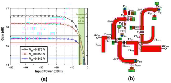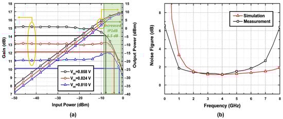 Finally, the IP1dB gain of the proposed VGLNA is determined by the steps described in Figure 7 with a measured range of shown in Figure 10b thanks to a fixed-bias prototype. The operation of three gain modes with respect to three different is shown in Figure 11a. It can be seen that IP1dB is −8 dBm, −4 dBm and −1.5 dBm with of 858 mV, 824 mV, and 810 mV, respectively, and it is confirmed that VGLNA using the ADB circuit operates with an extended IP1dB of 6.5 dB as compared to a counterpart with fixed of 858 mV.
