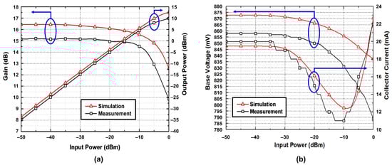In order to evaluate IP1dB gain of our VGLNA at the target frequency, the prototype is measured under a signal generator and a spectrum analyzer. Similar to the S-parameters measurement setup, the circuit is applied with the same DC supplying voltages. A digital multimeter is used to measure the biasing voltage across the different input power levels. By sweeping the input power from −50 dBm to 0 dBm, a graph of gain and output power versus the input power is shown in Figure 10a. Note that these gain and output powers have different values from . The results show a similar tendency to the simulation ones, and it can be seen that the VGLNA always exhibits a gain of >10 dB within the overall input range. There is a slight difference in the initial gain between the two measurement schemes, i.e., using the S-parameters network analyzer and using the spectrum analyzer; due to their accuracy, there is instability in the cable loss and device characteristics. The overall range of is shown in Figure 10b. Increasing the input power from −50 dBm to 0 dBm, the observed voltage delivered to the base for biasing decreases from 858 mV to 798 mV. As a result, the DC collector current decreases, denoting a gain reduction mechanism in the LNA operation. It should also be noted that the similarity of the 1.2 dB lower measured gain (in comparison with the simulated gain while simulated) and the measured collector currents is due to the insertion loss of the coupler, which is not modeled accurately in the simulation.