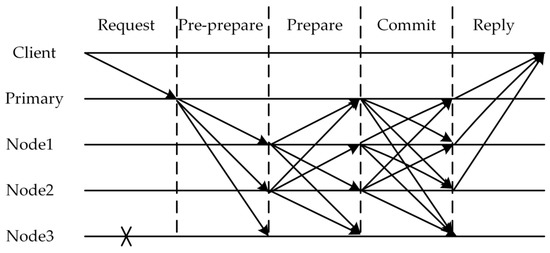 As for the PBFT algorithm, it is a consensus algorithm widely used in the consortium chain at present. Lambert first described the Byzantine problem (BFT) in his paper “The Byzantine General Problem” [12]. Miguel Castro and Barbara Liskov proposed the PBFT consensus algorithm in 1999 and introduced it in detail in 2002 [13]. The PBFT algorithm divides nodes into client, primary, and ordinary nodes. The flow of the algorithm is divided into request, pre-prepare, prepare, commit, and reply, as shown in Figure 1 [14]. As a popular consensus algorithm in consortium chains, the PBFT algorithm reduces the complexity of the problem from the exponential to the polynomial level. PBFT can apply it to practical systems [15]. However, the increasing scale of network nodes has dramatically challenged the consensus efficiency and security of the PBFT algorithm in recent years due to the rise of consortium chains.