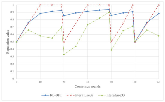 The reputation model designed for this paper is analyzed and compared with the reputation model proposed in the literature [32,33], mainly comparing the changes in reputation values under different reputation value models. The parameters in Equation (2) are assumed to be k = 0.9; β = 3; γ = 9; set 19 rounds, 39 rounds of node malicious behavior, and every 50 rounds as a consensus cycle; δ = 50; and the results are shown in Figure 6.