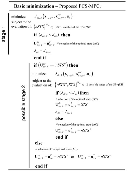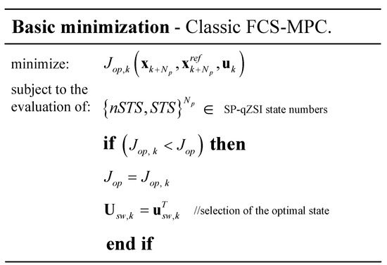 In general, the strategy presented in Figure 2 can become computationally demanding when dealing with long prediction horizons, since the number of states to be evaluated could be large, which would imply that the computational capacity, may not be enough to implement the algorithm. As the long prediction horizon is required in some systems to improve performance, the next section presents an alternative to reduce the computational load in an FCS-MPC strategy for an SP-qZSP.