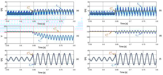 Response of the proposed FCS-MPC scheme to a reference step of 200 W to 600 W: (a) response of the current of the inductor with a horizon and , (b) response of the current of the inductor with a horizon and , (c) voltage response of the capacitor with a horizon and , (d) voltage response of the capacitor with a horizon and , (e) response of the output current with a horizon and , (f) response of the output current with a horizon and .