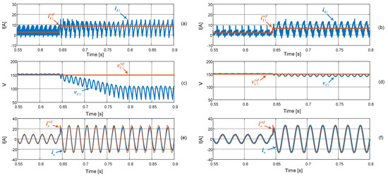 In the fourth test, the same change in reference power occurs as in the previous tests. Here, the proposed FCS-MPC is operating with a prediction horizon and , which allows the generation of the desired comparison effect. Figure 7d shows that the voltage response performs better than in the three tests performed previously. Similarly to the results observed in Figure 6d, the voltage satisfactorily follows the reference path, but shows a voltage ripple of no more than 10 [V] when the change in reference occurs. Regarding the current shown in Figure 7b, it presents a more pulsating behavior than the results of Figure 6b and the maximums of current are lower, registering values that do not exceed 13[A]. Finally, the output current shown in Figure 7f properly follows the path of the sinusoidal reference at all times. There are no difficulties to reach the maximum of the reference, unlike what occurs in the results of Figure 7e.