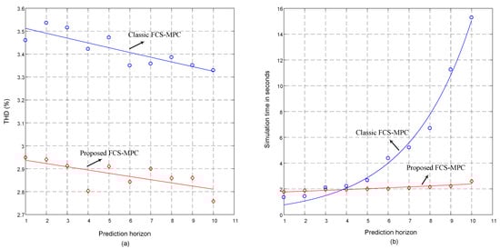 The results of Figure 8a were processed with an exponential type fit in the MATLAB software. Here, the results confirm that the THD can decrease significantly as the length of the prediction horizon increases, regardless of the control strategy implemented. However, the proposed FCS-MPC strategy presents, on average, a lower THD than the classical FCS-MPC strategy of 2.8% and 3.5%, respectively. Both strategies show a decreasing trend as the length of the horizon advances. However, a small difference can be observed in the rate of decreasing of the classical FCS-MPC strategy, which is slightly faster than the rate of the proposed FCS-MPC.