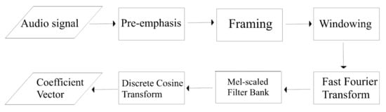 The calculation of the MFCC typically involves the following steps: pre-emphasis of the high frequency portion, segmentation of the signal into short-duration frames, multiplication of the frames with a desired window, calculation of fast Fourier transform, application of a Mel filter bank, and calculation of discrete cosine transform, as shown in Figure 1 [16]. This procedure is similar to the human auditory system’s perception, which is more sensitive to low-frequency components.