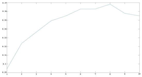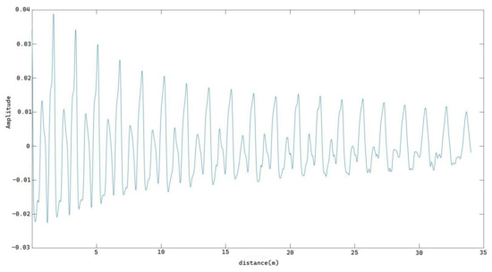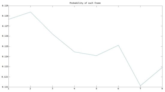 In this experiment, x represents the sampling point position in the spatial domain, while t represents time. The length of the total 0.1 s signal, denoted as a, is 34 m. We can calculate n, where is the square value of amplitude. The constant m is assumed to be 1 in order to reduce computational complexity. Then, we can calculate the total probability of this frame and continue with the calculation of the MFCC. A triangle window is applied afterwards. We then perform FFT and pass the resulting signal through a Mel-scaled filter bank, which is a 13-order filter bank, to obtain 13 coefficients from 1 frame. After applying Discrete Cosine Transform, we can obtain the original MFCC, which we then multiply by the probability. The probability of each frame from one standard English speaker’s pronunciation is shown in Figure 13.