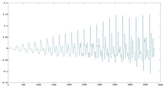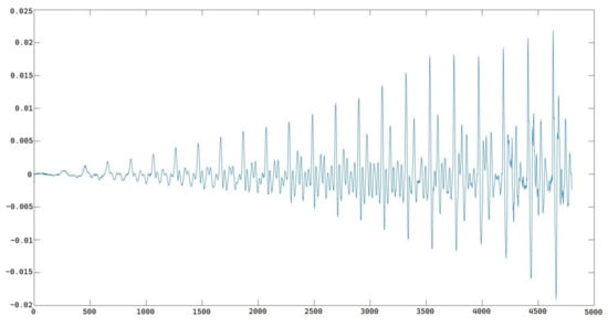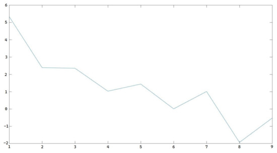 Next we calculated the derivation of the amplitude part from each frame with the same pitch frequency as matrix (15). In this case, we have 10 frames, so the derivation matrix will be a matrix. The derivation matrix quantifies the amplitude changes with the time changes. Figure 12 shows the derivation representing the amplitude changing trend in the 225 Hz pitch frequency.