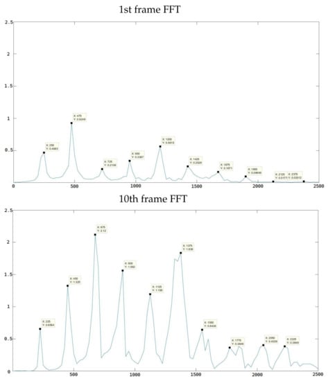 We applied the fast Fourier transform to each frame of the speech signal, and then we searched for the peak amplitude in the frequency domain. As shown in Figure 10, when we compare the FFT figures obtained from the 1st and 10th frames, we can see that the pitch frequency does not change significantly, but the amplitude in each frequency changes dramatically.