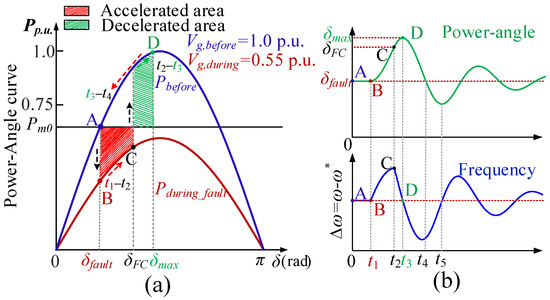 As is shown in Figure 2a, the maximum deceleration area should be larger than the maximum acceleration area to remain in synchronization with the grid under large distances according to the equal area criterion (EAC) [39]. Figure 2b shows the time-domain response of power angle/frequency. It can be mainly divided into four segments. The grid fault occurs at point B and time t1. During the first segment from point B to point C (from t1 to t2), the frequency will accelerate, and the transient power angle is increased. This area is called the accelerated area. At this moment, a large virtual inertia is needed to slow down the deviation trend and reduce the maximum frequency deviation. At point C, the fault is cleared. During the second segment from point C to point D (from t2 to t3), the frequency will decelerate, but ∆ω is greater than zero, and then the power angle is still increased. This area is called the decelerated area. In this process, small inertia is needed to make VSG return to the nominal frequency quickly. For example, if the virtual inertia is changed to 0 at point C, the frequency can return to the nominal frequency instantaneously. Then, the power angle of VSG will reduce, return back to point A, and remain stable in the steady state. The decelerated area for transient stability is no longer needed, which is totally different from the SG.
