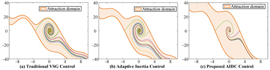 The attraction region analysis can represent the transient synchronization stability margin. According to the equivalent dynamic Equation (12), the attraction regions among the traditional VSG control (kJ = 0, kD = 0; → ∆J = 0, ∆D = 0), adaptive virtual inertia control (kD = 0; → ∆D = 0), and the proposed AIDC control method can be drawn and seen in Figure 5. Through the comparison of the above attraction regions, the proposed AIDC method has a broader attraction region. Therefore, transient synchronization stability under AIDC control is greatly enhanced.