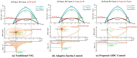 Power angle curve, phase portrait, and time-domain response between the traditional VSG control (∆J = 0, ∆D = 0), adaptive virtual inertia control (∆D = 0), and the proposed AIDC control method.
