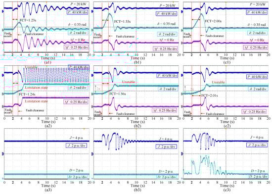 Figure 9(a1,a2) shows the waveforms of the traditional VSG control under different fault clearance times (FCTs). The critical fault clearance time CCT1 under this condition is 1.23 s. In Figure 9(a1), FCT = 1.23 s ≤ CCT1, and VSG can recover to stable. In Figure 9(a2), FCT = 1.24 s > CCT1, the VSG loses synchronization stability. Figure 9(a3) shows the value curves of virtual inertia J and damping coefficient Dm of the traditional VSG control. J and Dm remain fixed.