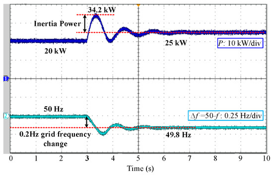 In this case, 0.2 Hz grid frequency change occurs at 3 s. The output active power and frequency of grid-connected inverter are shown in Figure 10. It can be seen that when the disturbance occurs at 3 s, the proposed AIDC control can provide the instantaneous inertia power for frequency support. The steady-state active power rises from 20 to 25 kW to provide the primary frequency regulation. The maximum output power is 34.2 kW to provide the inertia support. In addition, the AIDC control can realize frequency regulation according to the value of virtual damping coefficient. In addition, the converter under the Adaptive Inertia and Damping Coordination (AIDC) control can quickly reach the new steady state within about 2 s.