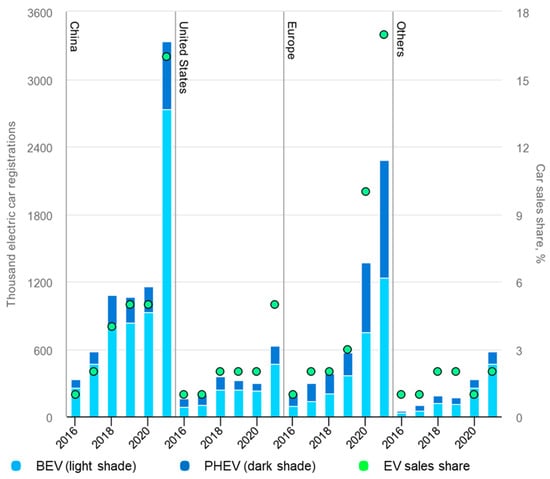 - IEA. Electric Car Registrations and Sales Share in China, United States, Europe and Other Regions, 2016-2021. IEA: Paris, France, 2016; Available online: https://www.iea.org/data-and-statistics/charts/electric-car-registrations-and-sales-share-in-china-united-states-europe-and-other-regions-2016-2021 (accessed on 9 March 2023).