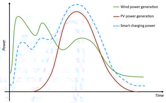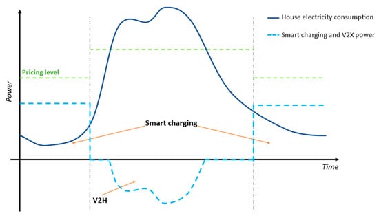 In order to mitigate the mileage concern, EVs with larger battery capacities, such as the Tesla Model S with 85 kWh or the Nissan Leaf with 60 kWh, are receiving more and more attention. In the majority of situations, a vehicle’s daily trip energy requirement is less than the energy available on vehicle’s battery. As a result, in addition to offering the energy required for driving, EV batteries bring a great amount of unused capacity. EV as a distributed energy storage system can become an essential element of the smart grid if the idle battery is used to store and feed power to the grid or consumers [5]. EVs as a short-term energy storage system can supply electricity to household appliances throughout blackouts (vehicle-to-home (V2H)), provide quick charging to other EVs (vehicle-to-vehicle (V2V)), or feed energy to the transmission network (vehicle-to-grid (V2G)) [1,5].