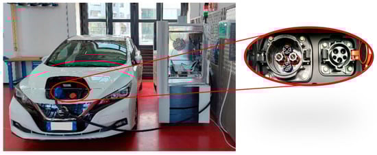 A NISSAN LEAF 2018 (Figure 6) is used in the test, which has two types of batteries that can deliver high and low voltages. A traditional lead-acid 12 V battery and a Li-ion high-voltage battery pack are available. The traction motor is powered by a high-voltage battery pack that stores energy at around 360 V DC. This car is designed to perform bidirectionally (in our study for V2H); in charging mode, the high voltage battery stores energy drawn from the charging station. Conversely, in discharging mode, it acts as an electricity source, releasing its stored energy to supply energy either to the car electric engine or to the home to balance its load partially or fully. Two ports are available on the NISSAN LEAF for Normal charge and Quick charge. Type 2 inlet is used when charging at home or at public slow and fast AC points. While the CHAdeMO inlet is used to carry high power during rapid DC charging. In order to have V2X services, the CHAdeMO inlet should be used [27].