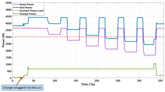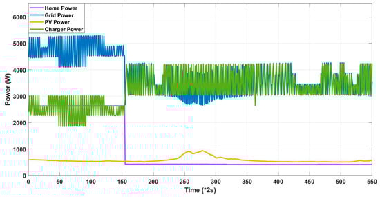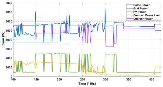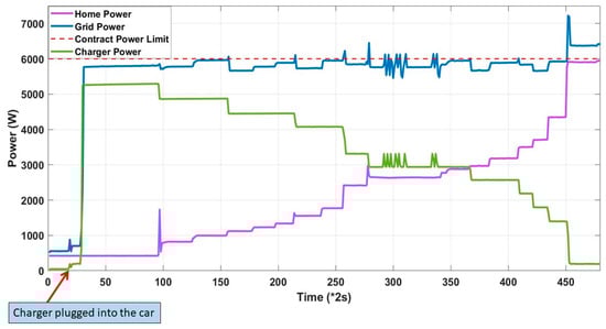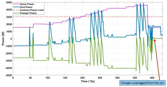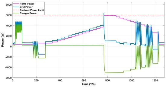 The first test is carried out to see how the bidirectional charger behaves when a house consumption is present and changes over time. The result of this test is shown in Figure 9. According to the charger’s datasheet, it should be able to adjust its power consumption according to the house consumption from the grid, i.e., the capability of smart charging. PV production is excluded from this test to assess the charger’s fundamental performance. The household consumption is first set to 0 W, and then it is increased by 200 W per minute until a power value higher than the contract power limit is reached. The contract limit is defined 6 kW in the configuration file, and the tariff of electricity is assumed to be constant. The results illustrated in Figure 7 indicate that the charger appropriately adjusts its power based on the home load value and tries to keep total power within the contract limit. The charger’s power reduction is continued till the charger’s minimum power (190 W) is attained. After this point, even when the contractual restriction is exceeded, the charger does not modify its power.