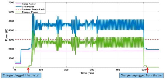 It is also worth noting that the charger operates only in charging mode for the vehicle SoCs lower than the MBP, see Figure 14. However, the charging power is extremely unstable, indicating that the charger is having problems finding a sufficient power threshold. The charger’s power consumption ranges from a minimum of 400 W to a maximum of 2 kW around a specific power value. However, the power absorbed from the grid is considerably greater than the contractual restriction of 3 kW specified in the configuration file.