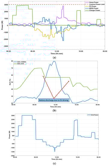 Real house consumption and PV production measurement data from a typical Italian house, as well as an employee’s EV usage, are utilized as input for conducting simulations. Figure 16 shows the outcomes of a one-day simulation. As illustrated in Figure 16a, the BESS and the EV charging/discharging are appropriately managed in accordance with the amount of available PV production and consumption at home. The established EMS balances the energy in the house based on the price of selling/buying of electricity, battery ageing, and other defined constraints. For instance, limits of 20–80% are considered for the SoC of the EV and the BESS SoCs to avoid rapid battery aging (see Figure 16b). The grid exchange power for the same day is shown in Figure 16c, and it is clear that energy is mostly purchased early in the morning and late in the afternoon when the electricity buying price is lower, while extra PV is sold to the grid at noon when the electricity selling price is higher.