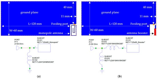 Firstly, the antenna booster and monopole antenna designs have been simulated with a reference ground plane size of 120 mm × 60 mm + 40 mm × 11 mm printed on an FR4 (Flame Retardant #4 epoxy) substrate, commonly employed in PCBs due to its competitive price (Figure 1) [21]. Electromagnetic simulations are performed with MoM (Method of Moments) software (IE3D). Once both designs have been adjusted for operation for the reference ground plane, different ground planes ranging from 20 mm × 30 mm to 200 mm × 200 mm (using steps of 10 mm) are going to be tested with the same antenna and matching network to see how many could be reused with the same design, without having to redo the design for each size.
