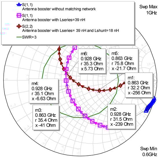 Steps to match the reactive capacitive impedance at 900 MHz of the antenna booster: a series and shunt inductance. The simulation considers the matching network of Figure 1 (Lseries = 39 nH, Lshunt = 18 nH, including real component, i.e., finite Q).