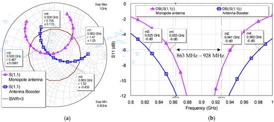 (a) Simulated input impedance for the monopole antenna and antenna booster, each with its matching network, as shown in Figure 1. (b) Simulated S11 of the monopole antenna and antenna booster showing that the antenna booster features 1.8 times more bandwidth.